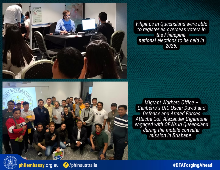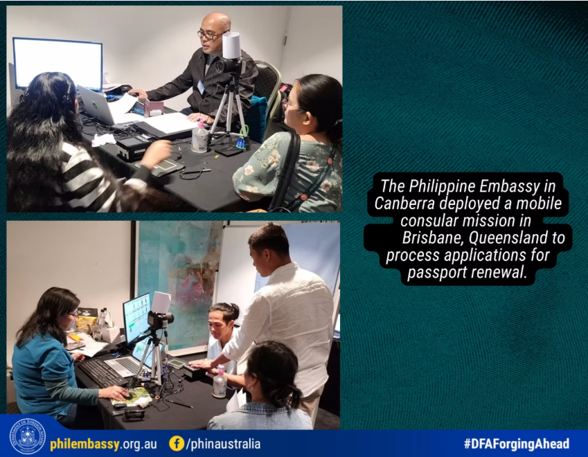 The Philippine Embassy in Australia headed by Consul-General Aian Caringal, led a successful five-day mobile consular mission at Eatons Hill Hotel, Queensland serving over 600 Filipinos with the assistance of the Philippine Consulate Office of Queensland led by Consul Sheryll Gabutero and her honorary staff and Filipino Community leaders.