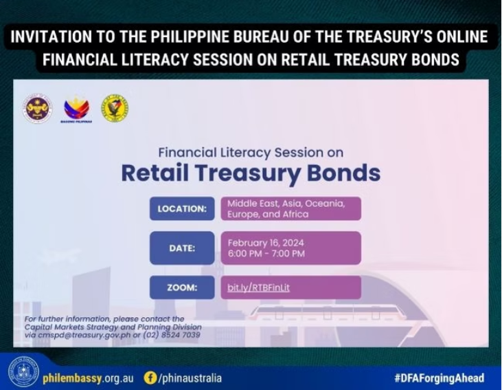 CANBERRA (01 FEBRUARY 2024) – The Philippine Government through the Bureau of the Treasury is inviting Filipinos in Australia who are interested to deepen their knowledge and understanding of government securities to a Financial Literacy Session on Retail Treasury Bonds (RTB). The Bureau of the Treasury will be hosting the online Financial Literacy Session on 16 February 2024 at 6:00 PM AEST.